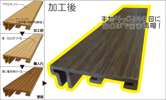 合成樹脂や合成木材等の新建材に、印刷では決してまねできない、一本一本個性のある 立体感を表現した、弊社オリジナル技術です。 |